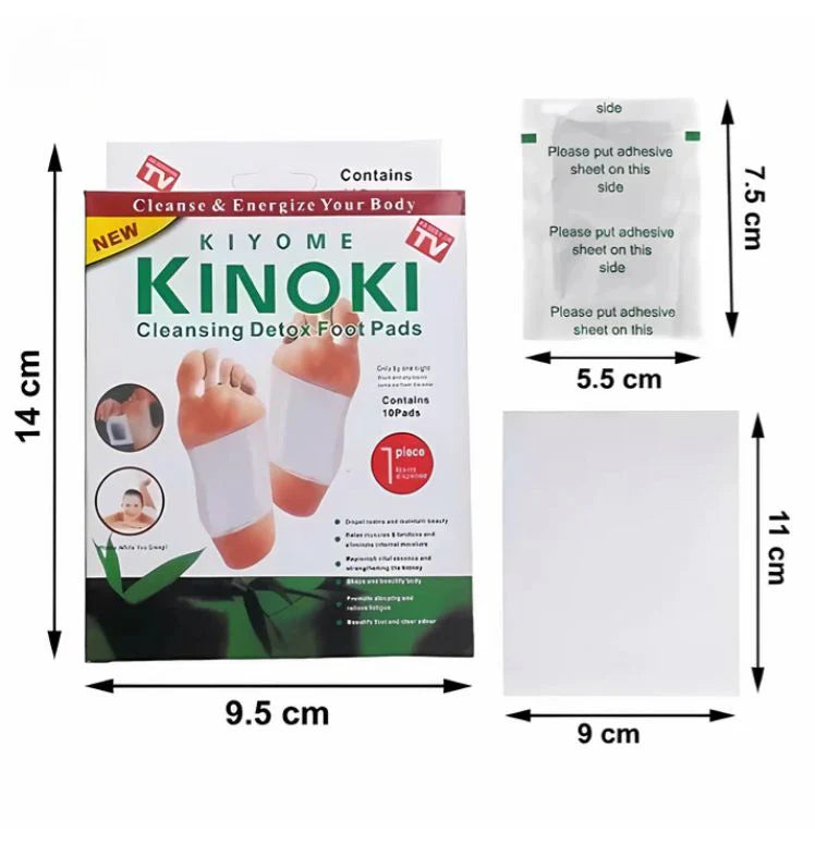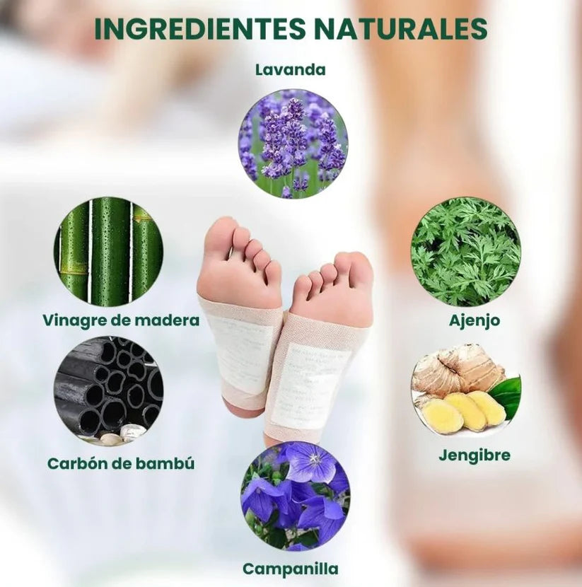 Parches Desintoxicantes Kinoki®, una fórmula 100% natural con jengibre, y compuestos herbales usados en la medicina tradicional oriental. Cada parche estimula los puntos de acupuntura en tus pies, mejorando la circulación sanguínea, aliviando el estrés y eliminando toxinas acumuladas 🍃
